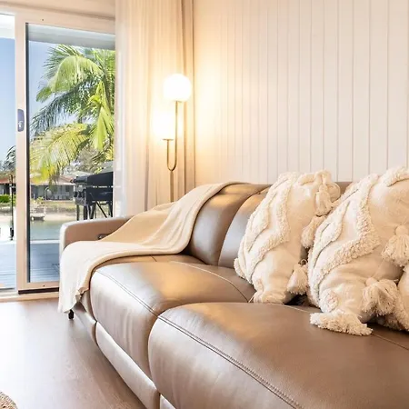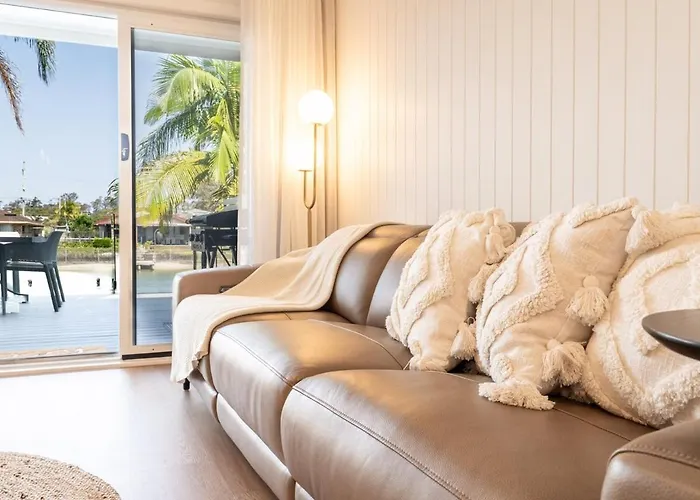 タルバジェラ・クリーク保護公園から4.1kmの場所に位置するゴールドコースト Ultimate Waterfront Bliss! 3Bd Tropical Escapeヴィラは、山の景色を望むテラスを提供しています。 ゴールドコーストのビーチに位置する宿泊は、プールでくつろぐことができます。